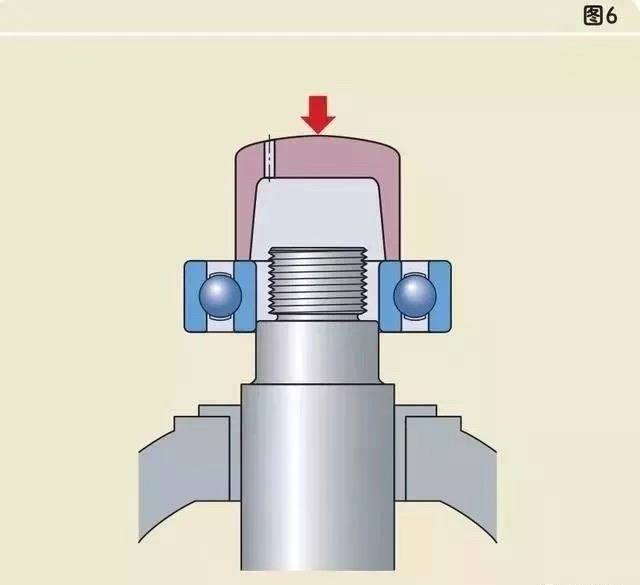 安裝配合不是太緊的小軸承時(shí),可以通過一個(gè)套筒(圖5、圖6)并以錘擊的方法,輕輕敲擊套筒把軸承裝到合適的位置。敲擊時(shí)應(yīng)盡量均勻的作用在軸承套圈上,以防止軸承傾斜或歪斜。